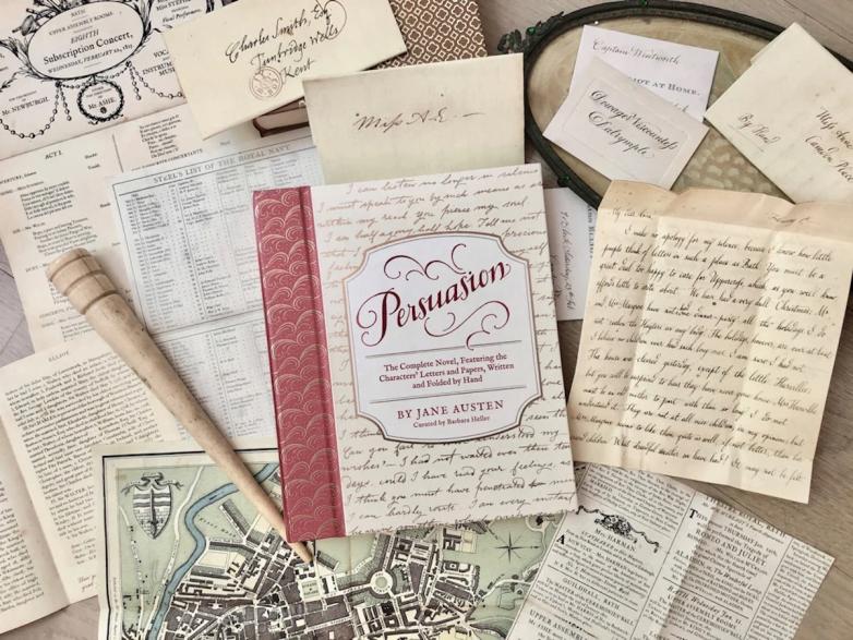 BH: Yes, the first thing I do is I research letters from the time to find handwriting that I think matches the character. Then find actual examples of letters that I feel could have been written by Captain Wentworth, or Mary Elliot Musgrove, or Mr. Collins, so that I have something to show a calligrapher so they can see what it is that I'm after. And then I work back and forth with the calligrapher. We just do tons of samples, looking at the ink color and the size of the writing, and is it pointy, is it angular? What is it about the sample that captures the essence of that character? Why is that particular handwriting right for Captain Wentworth? And then also, what kind of paper are they going to write on? Laid paper or rag paper, and the size, of course, is really important, too. And the color! The calligraphers do a million versions till we hit upon the one. I think we both feel it when it nails the handwriting and the emotion and the way it looks on the page.