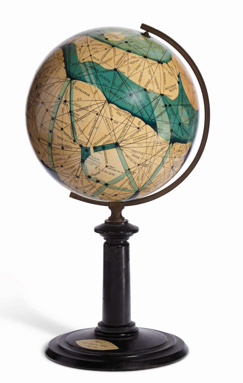 Brun crafted her Mars globes of plaster applied to existing spheres; her careful hand-painting and lettering transformed them into works of art. On a small plague on the base of the globe headed to auction, Brun attributed her work: Mars efter Lowekks Glober 1894-1914. She similarly credited Lowell on the globe at the Royal Museums Greenwich, although that example also contains a quotation from the Lord’s Prayer and a Socialist slogan: “Free Land. Free Trade. Free Men.” Brun donated her work to observatories and institutions, and she also sent one to Lowell in 1915.