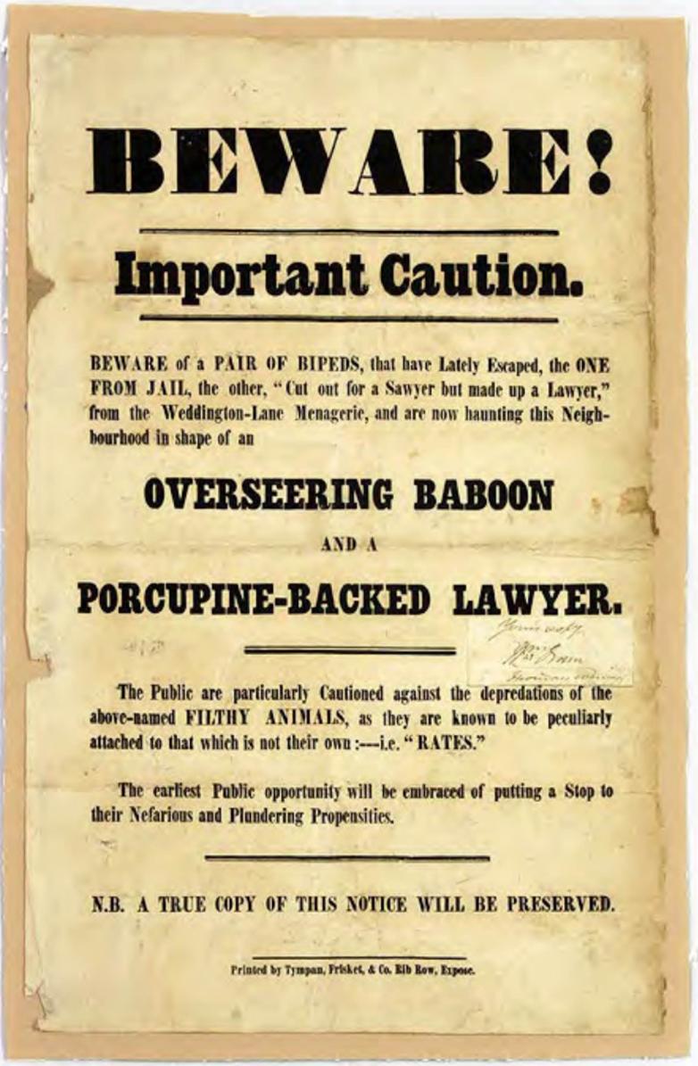 * Beware! Important Caution. Beware of a Pair of Bipeds, That Have Lately Escaped, The One from Jail, The Other "Cut out for a Sawyer but Made Up a Lawyer," From the Weddington Lane-Menagerie, And are Now Haunting this Neighbourhood in Shape of an Overseering Baboon and a Porcupine-Backed Lawyer. Printed by Tympan, Frisket, & Co, Rob Row, [c. 1850].