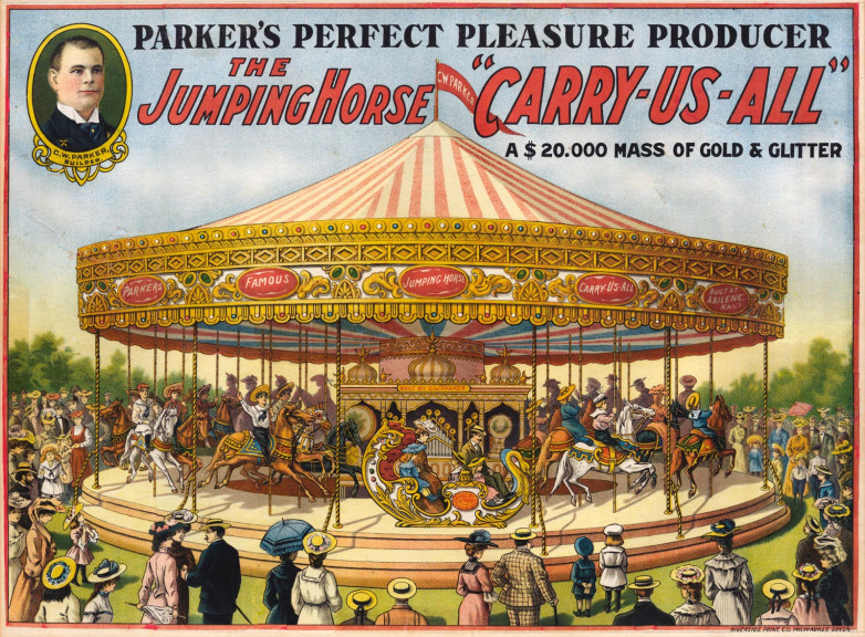 * C. W. Parker's The Jumping Horse "Carry-Us-All" Steam Riding Gallery advertising posters, two lithographic posters in colours, circa 1910, printed by the Riverside Print Company, Milwaukee