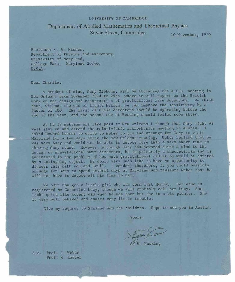 A remarkable letter in which Hawking writes about the hunt for gravitational waves (finally detected in 2016), asks his correspondent to aid his doctoral student Gary Gibbons (today an accomplished theoretical physicist), and announces the birth of his daughter (Catherine Lucy, who indeed goes by Lucy today).