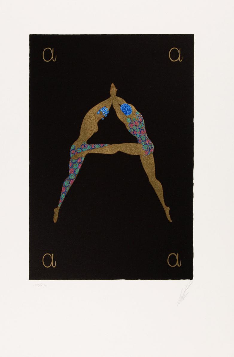 The Alphabet Suite in original portfolio box (26 plates), 1976 (estimate $5,000-7,000) features 26 serigraphs on paper plates depicting contortionist figures forming the 26 letters of the English alphabet, each editioned No. 32 of 350 and signed by the artist. Each of the 26 plates is unframed and offered in the original portfolio box.