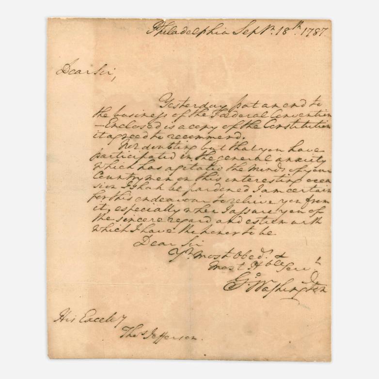 At the time of the Constitution’s signing, Jefferson, who authored the Declaration of Independence, was representing America in France. The Constitutional Convention was sworn to secrecy in the summer of 1787, but Washington was eager to pass the news along to Jeffersonas soon as the landmark document was signed. In this way, the letter not only reflects the high regard in which Washington held Jefferson, it also provides a critical link between two of the nation’s founders and offers a window into a world where breaking news could take weeks or months to arrive.