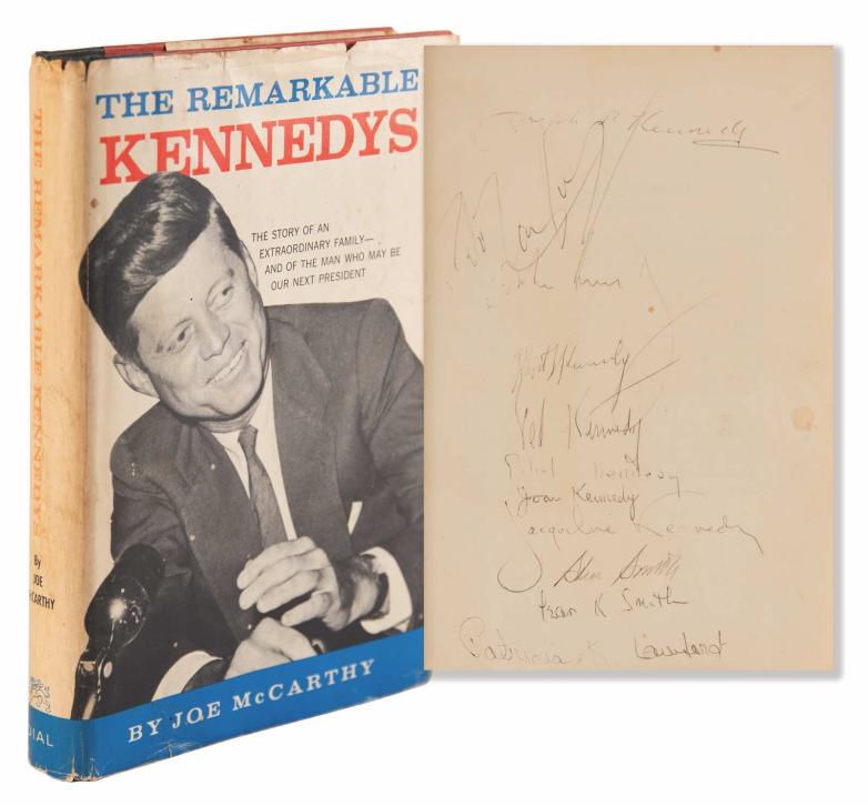 Highlights of the Kennedy-related material include a 1960 first edition of The Remarkable Kennedys which offers a glimpse into the Kennedy legacy and is signed by 11 family members, including Joseph P. Kennedy, President John F. Kennedy, and his wife Jacqueline, Robert F. Kennedy, and Ted Kennedy. Also included is The Peace Corps Act page signed by JFK. This signed page from the pioneering Peace Corps legislation was presented to Bill Moyers and has been in the possession of the Moyers family since its signing in 1961.