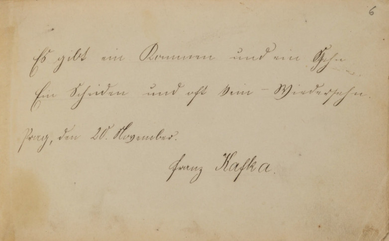 The early scrap of writing from a teenage Kafka in his own hand appears on page six of the 'liber amicorum' or autograph book of his close childhood friend Hugo Bergmann who went on to be the founder of Israel's National Library. Signed by Kafka and dated Prague, November 20, 1897, it reads in the original German: