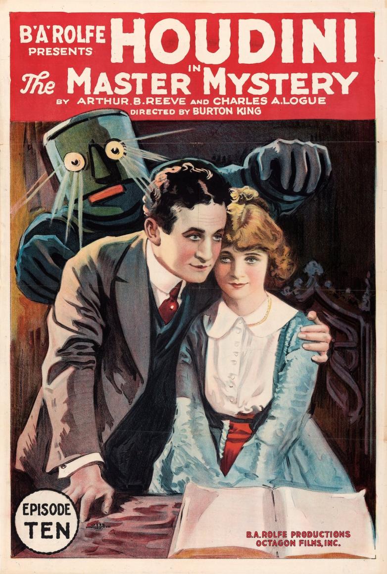 The one-sheet for Chapter 10 of The Master Mystery, in which illusionist Harry Houdini and cinema’s first robot make their on-screen debuts.