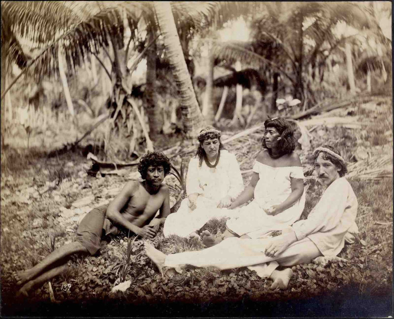 Robert Louis Stevenson and his wife Fanny with two Marquesas islanders in Butaritari, Gilbert Islands, c. July 1889.