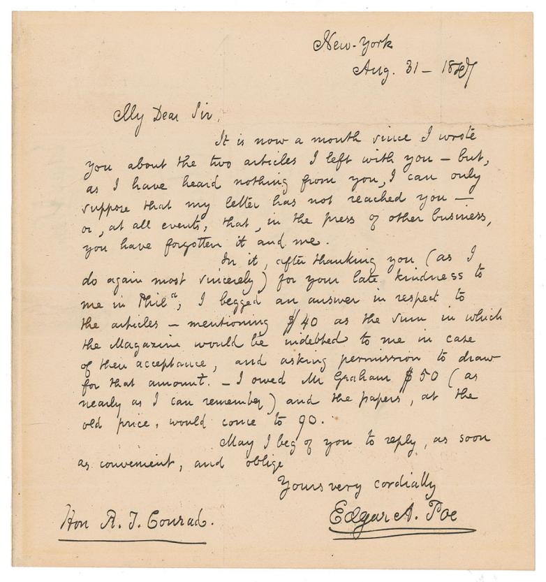 Edgar Allan Poe handwritten letter with Poe, hoping to publish in the year of 'Ulalume'. The one-page letter signed "Edgar A. Poe," August 31, 1847. Poe's final letter to the Philadelphia lawyer and playwright Robert Taylor Conrad, editor of Graham's Magazine. In part: "It is now a month since I wrote you about the two articles I left with you—but, as I have heard nothing from you, I can only suppose that my letter has not reached you—or, at all events, that, in the press of other business, you have forgotten it and me." Accompanied by an engraved portrait and an export certificate from the French Ministry of Culture.