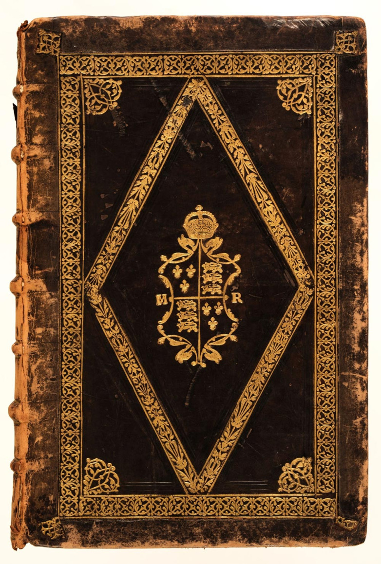 The folio volume has a later calf binding c. 1800 but with the original gilt-decorated panels bearing the royal arms and monogram ‘M R’ of Mary relaid. The border design is consistent with the workshop of the Medallion binder who worked from the end of King Henry VIII’s reign through to the early years of Queen Elizabeth I, or the equally anonymous King Edward VI and Queen Mary Binder, a London atelier active from about 1545 until at least 1558.