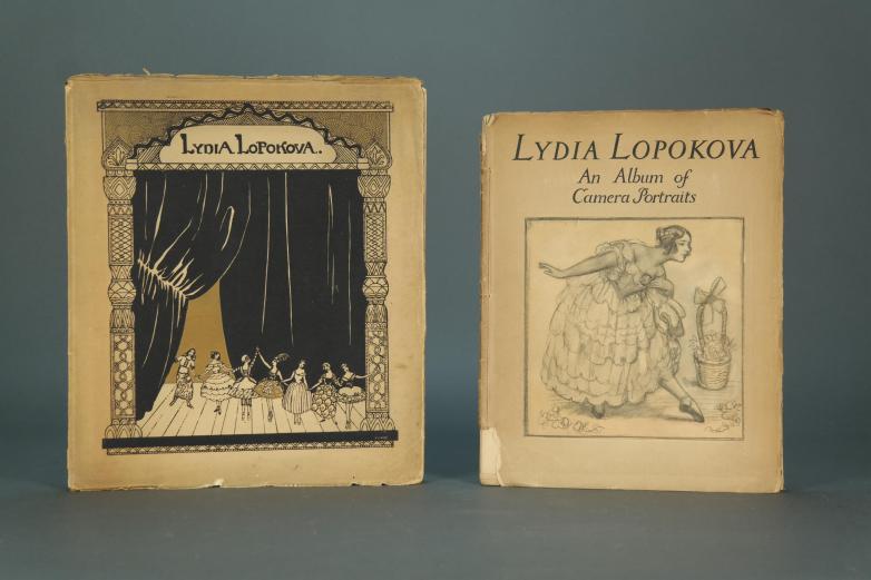 A 1920 book titled Lydia Lopokova, An Album of Camera Portraits, is dance-focused but not expressly about ballet. The cover art is by Arabella Yorke, while the portrait frontispiece in sanguine was created by Glyn Philpot. Additionally, there are nine full-page pochoir illustrations, an interior portrait by Picasso, three decorations, and an appreciation by publisher Cyril W. Beaumont, London. Its estimate is $200-$400.