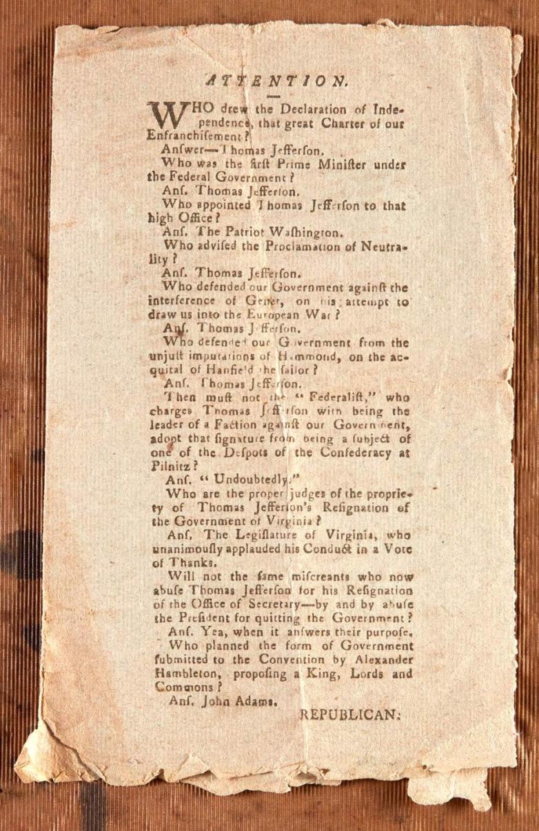 The pro-Jefferson text takes the form of a catechism and poses ten questions to its reader and offers ten answers in turn. It casts Adams and his Federalist colleagues as monarchists and “miscreants” and informs its audience that it was Jefferson who wrote the Declaration of Independence, not commonly known at the time. Described as “one of the most economical and effective pro-Jefferson texts produced anywhere in 1796” by historian Jeffrey L. Pasley, this handbill “taught the gospel of Thomas Jefferson as it would be passed down for generations.”