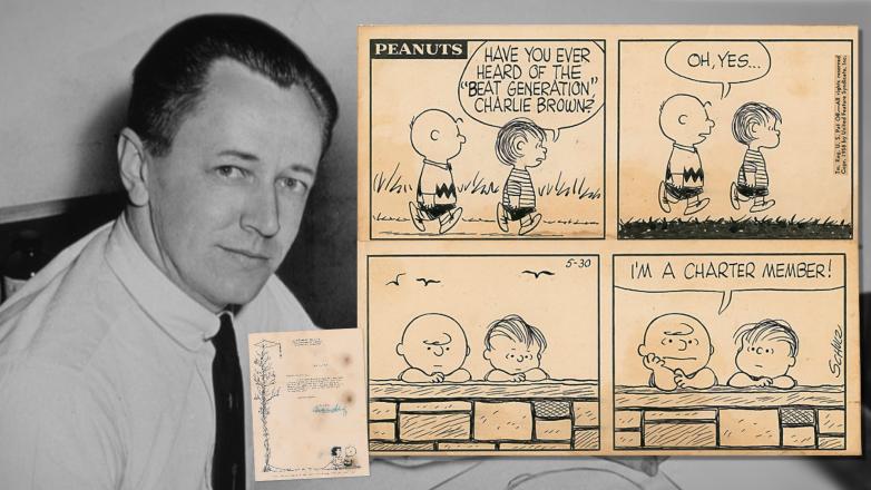 Includes a one-page typed letter about this strip, signed "Charles M. Schulz," personal Peanuts letterhead, June 12, 1958, in full: "I was very pleased to hear that you liked the strip about the 'beat generation.' Now, I do not have the originals here, but I am going to forward your letter to the syndicate, and if it is still available, I am certain that you will get it from them soon." Accompanied by the original mailing envelope for the letter.