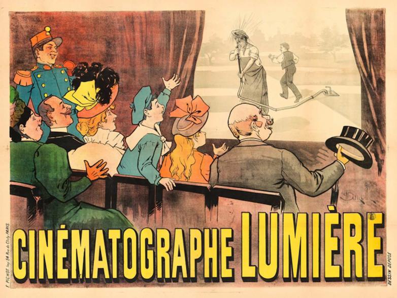 The first real public narrative movie screening took place in Paris in 1895 featuring the Lumière brothers' comedy short L'Arroseur Arrosé (The Waterer Watered). The event was promoted by a large poster that depicted an enthusiastic audience enjoying this new kind of entertainment.